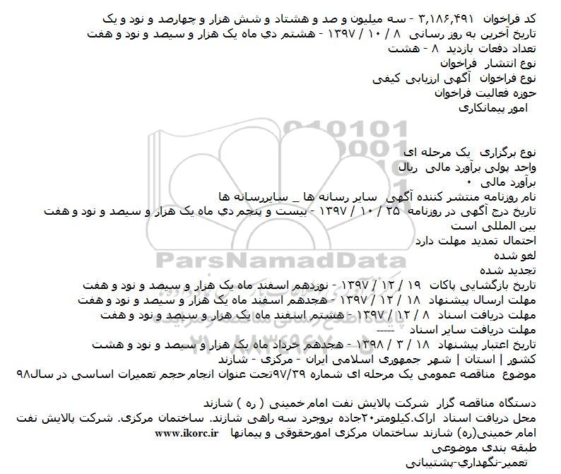 موضوع مناقصه عمومی یک مرحله ای شماره ۳۹/۹۷تحت عنوان انجام حجم تعمیرات اساسی در سال۹۸