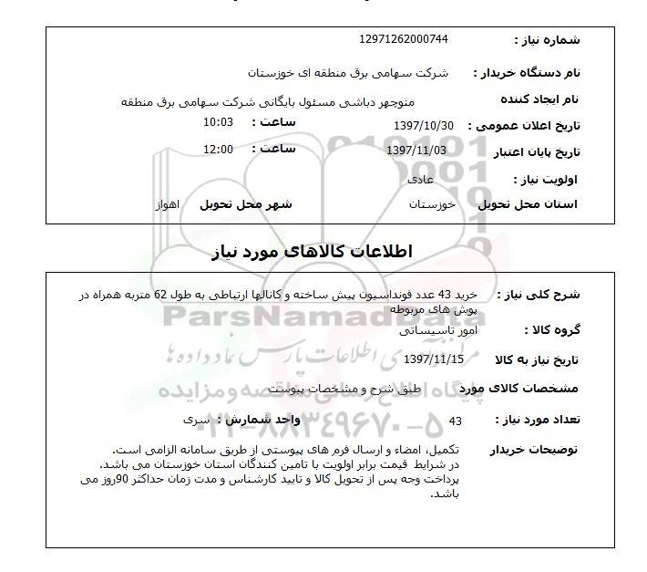 شرح کلی نیاز: خرید 43 عدد فونداسیون پیش ساخته و کانال های ارتباطی به طول 62 متر به همراه در پوش های مربوطه
