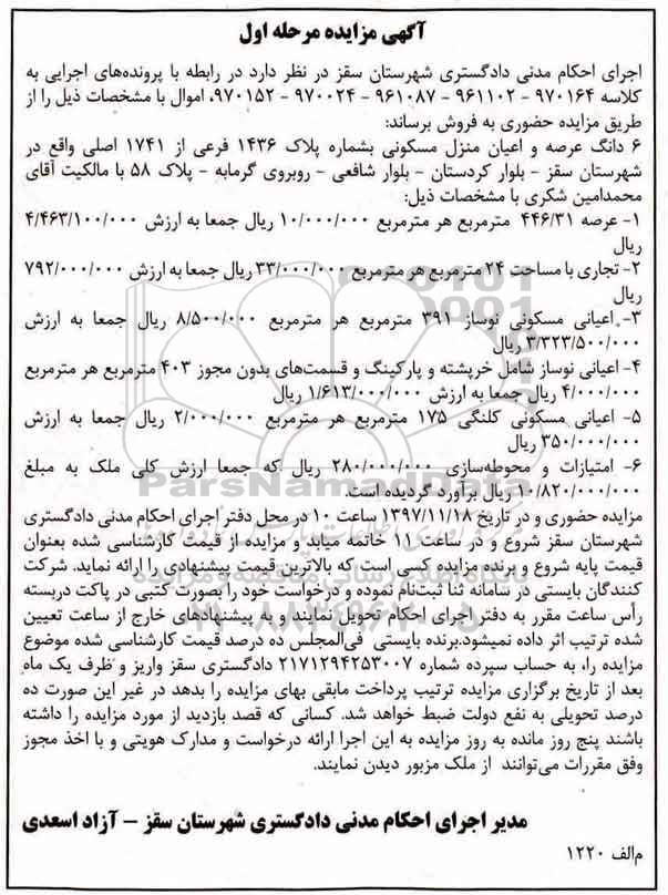 مزایده 6 دانگ عرصه و اعیان منزل مسکونی مرحله اول کلاسه 970164