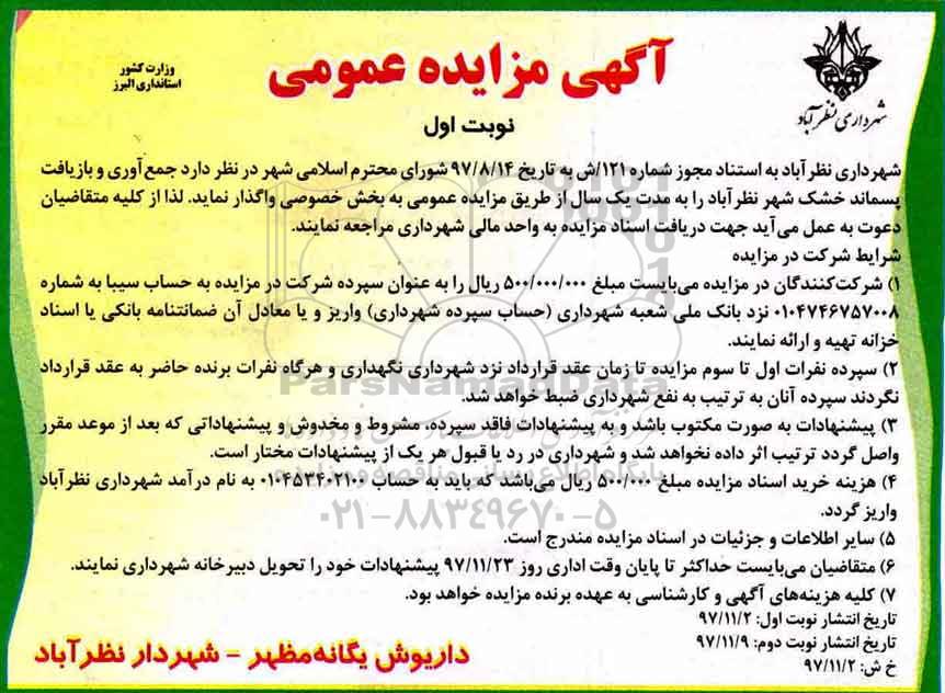 شهرداری نظرآباد در نظر دارد جمع آوری و بازیافت پسماند خشک شهر نظرآباد را به مدت یک سال از طریق مزایده عمومی به بخش خصوصی واگذار نماید. لذا از کلیه متقاضیان دعوت به عمل می آید جهت دریافت اسناد مزایده به واحد مالی شهرداری مراجعه نمایند.