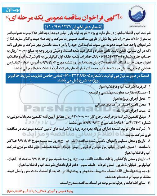 شرکت آب وفاضلاب اهواز در نظر دارد پروژه خرید لوله پلی اتیلن دو جداره به قطر 315 م.م به همراه واشر به متراژ 8750 متر را با شرایط ذیل از طریق مناقصه عمومی به شرکت واجد صلاحیت واگذار نماید. لذا از شرکت های واجد صلاحیت دعوت می شود نمایندگان خود را با در دست داشتن مهر شرکت و معرفی نامه که در آ« نشانی تلفن ثابت، تلفن همراه و نمابر قید شده است و فیش واریز وجه به مبلغ 100.000 ریال به حساب جاری شماره 0102952722001 بانک صادرات شعبه فلکه اول کیانپارس به نام شرکت آب و فاضلاب اهواز جهت خرید اسناد مناقصه تا پایان وقت اداری روزشنبه مورخ 97.11.6 به آدرس اهواز ـ کیانپارس خیابان 5 غربی ـ نبش خرداد ـ طبقه سوم ـ دفتر قراردادهای شرکت آب و فاضلاب اهواز معرفی نمایند.