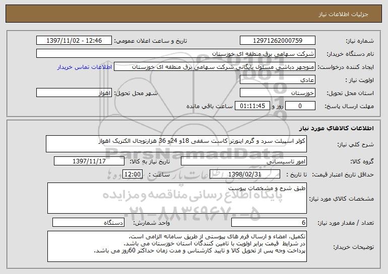شرح کلی نیاز: کولر اسپیلت سرد و گرم اینورتر کاست سقفی 18و 24و 36 هزارتوچال الکتریک اهواز