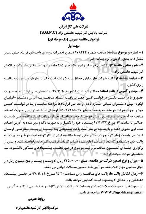 شماره و موضوع مناقصه: مناقصه 978442 ( پیمان تعمیرات دوره ای واحدهای فرآیندهای سبز شامل دانه بندی ، اویلی واتر ، پساب ، فلر )