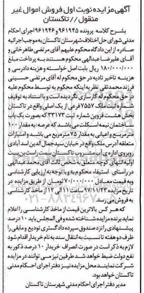 مزایده یک باب ساختمان نیمه اسکلت پرونده 961945
