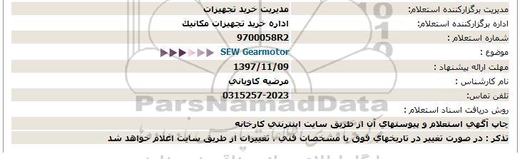 استعلام بها و موضوع استعلام استعلام, استعلام SEW Gearmotor به اطلاع کلیه شرکتها و افراد متخصص واجد شرایط میرساند، آگهی گذار در نظر دارد از طریق استعلام بها، نسبت به انتخاب و دریافت پیشنهادات اقدام نماید. این استعلام با کد آگهی ثبت شده در سامانه خبرگزاری پارس نماد : 1479161 منتشر شده است. مشخصات استعلام : تاریخ شروع استعلام: 1397/11/03 آخرین مهلت ارسال پیشنهاد قیمت : 1397/11/09 و محل اجرای پروژه : استان اصفهان میباشد. استعلام قیمت مورد درخواست : استعلام, استعلام SEW Gearmotor با دستهبندیهای تخصصی و گروه های مرتبط : تجهیزات و ماشین آلات صنعتی, استعلام اطلاع رسانی میگردد.