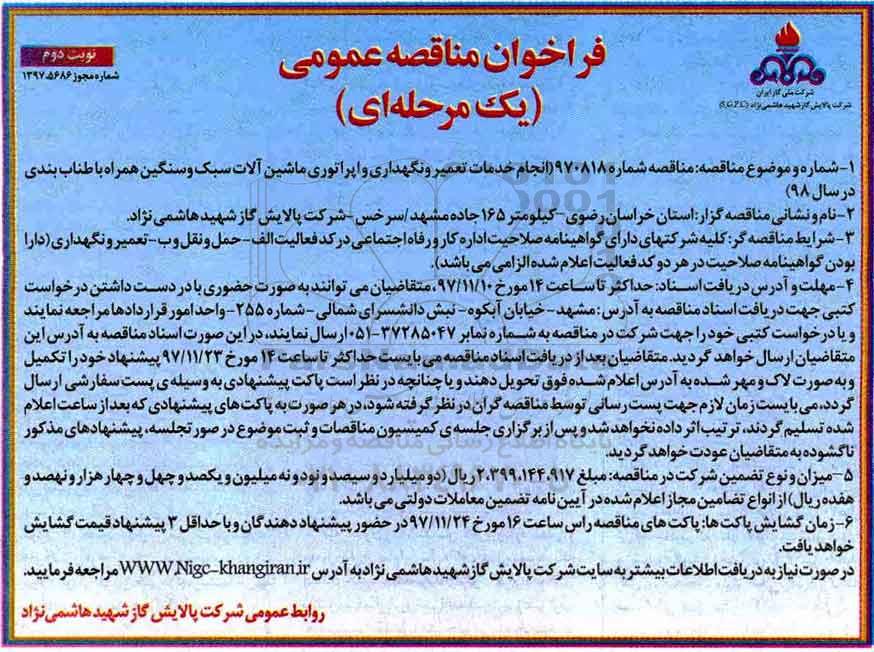 شماره و موضوع مناقصه: مناقصه 970818 (انجام خدمات تعمیر و نگهداری و اپراتوری ماشین آلات سبک و سنگین همراه با طناب بندی در سال 98)