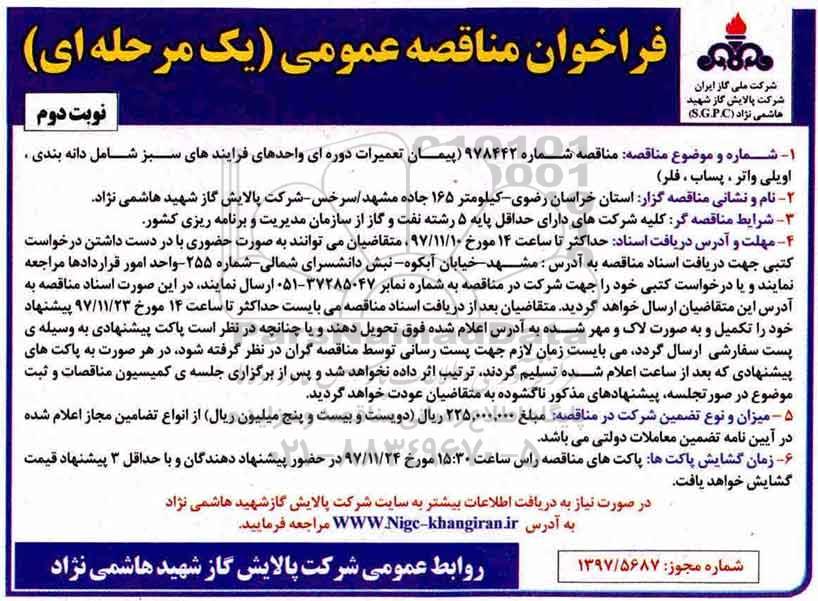 شماره و موضوع مناقصه: مناقصه 978442 (پیمان تعمیرات دوره ای واحدهای فرآیندهای سبز شامل دانه بندی ، اویلی واتر ، پساب ، فلر)