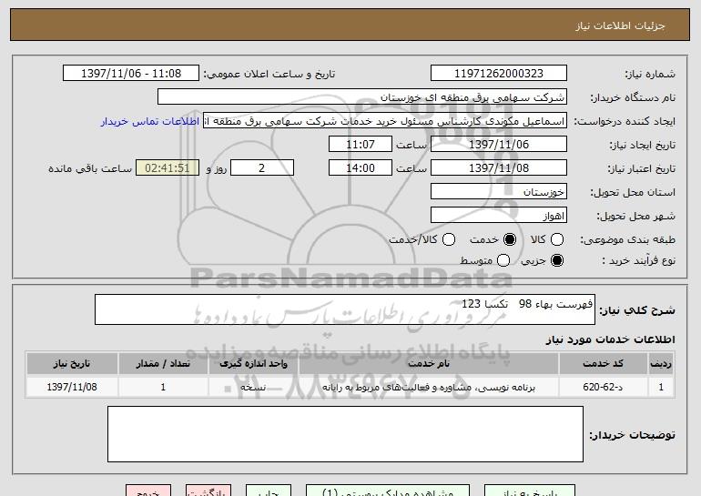 شرح کلی نیاز: فهرست بهاء 98 تکسا 123