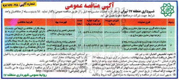 شهرداری منطقه 17 تهران درنظر دارد عملیات مشروحه ذیل را ا ز طریق مناقصه عمومی واگذار نماید لذا بدینوسیله از متقاضیان واجد شرایط جهت شرکت در مناقصه دعوت بعمل می آید