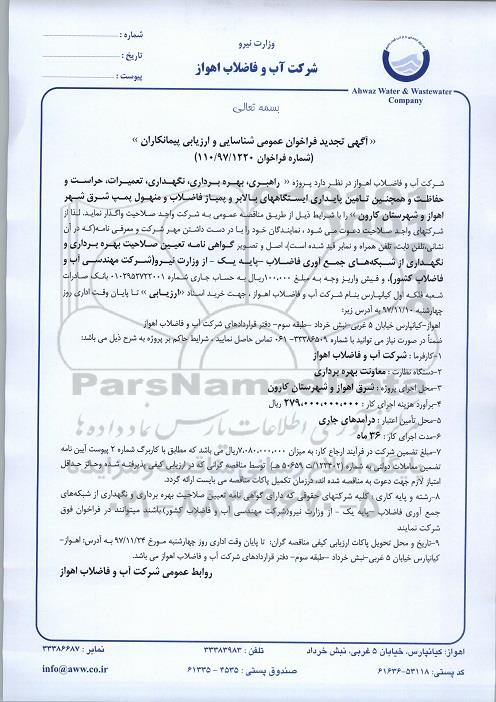 لذا از شرکت های واجد صلاحیت دعوت می شود، نمایندگان خود را با در دست داشتن مهر شرکت و معرفی نامه (که در آن نشانی، تلفن ثابت، تلفن همراه و نمابر قید شده است)، اصل و تصویر گواهی نامه تعیین صلاحیت بهره برداری و نگهداری از شبکه های جمع آوری فاضلاب به حداقل پایه دو - از وزارت نیرو (شرکت مهندسی آب و فاضلاب کشور)، و فیش واریز وجه به مبلغ 100.000 ریال به حساب جاری شماره 0102952722001 بانک صادرات شعبه فلکه اول کیانپارس به نام شرکت آب و فاضلاب اهواز، جهت خرید اسناد ارزیابی» تا پایان وقت اداری روز 4شنبه 97.11.10به آدرس زیر