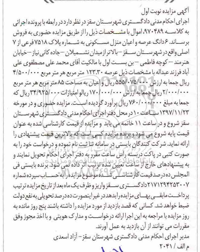 مزایده 6 دانگ عرصه و اعیان منزل مسکونی 123.30 مترمربع نوبت اول کلاسه 970489