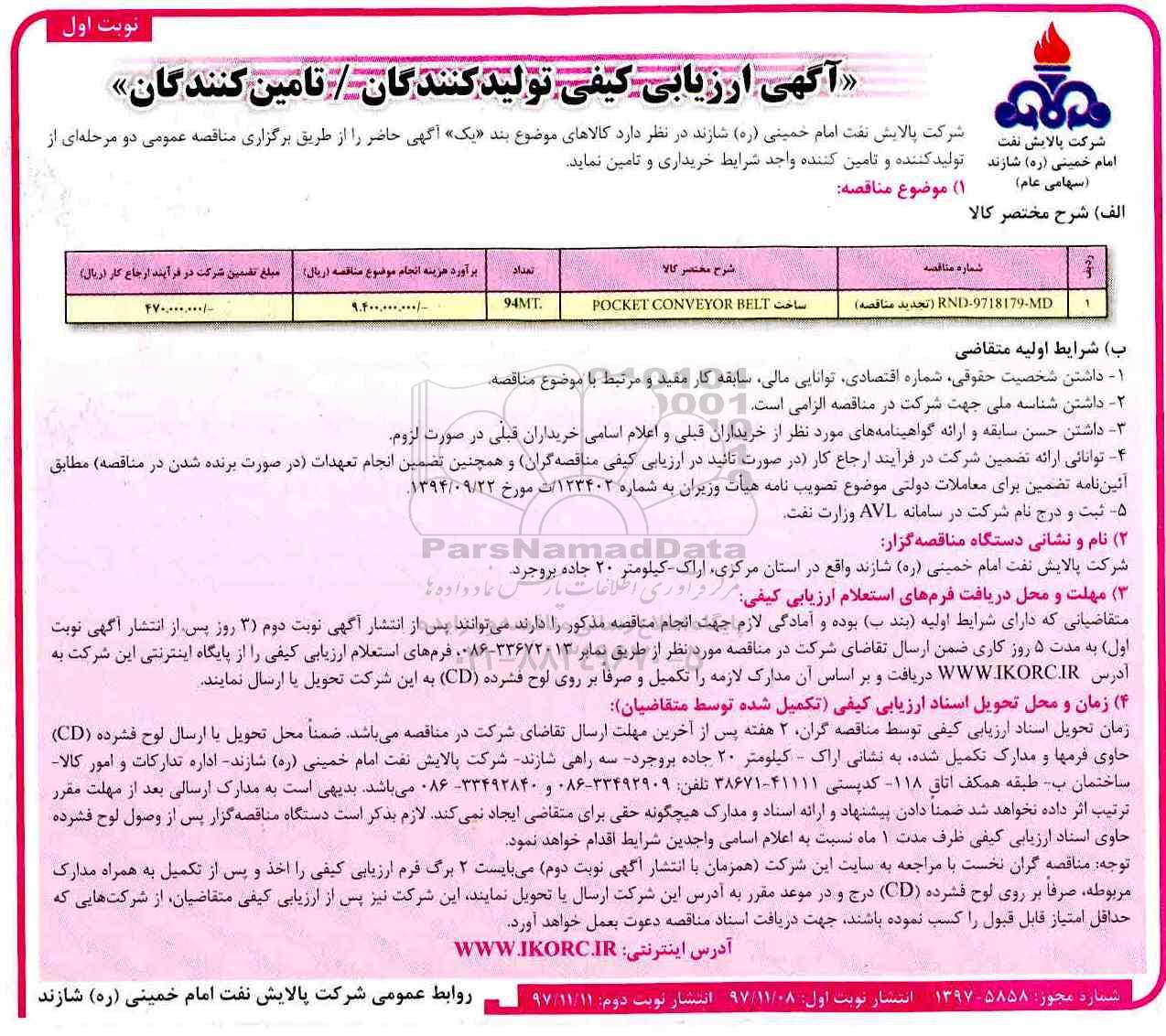 ارزیابی کیفی ساخت POCKET CONVEYOR BELT از کلیه افراد متخصص و شرکتها واجد شرایط دعوت به عمل میآید در مناقصه با کد خبرگزاری پارس نماد: 1485372 شرکت نمایند.