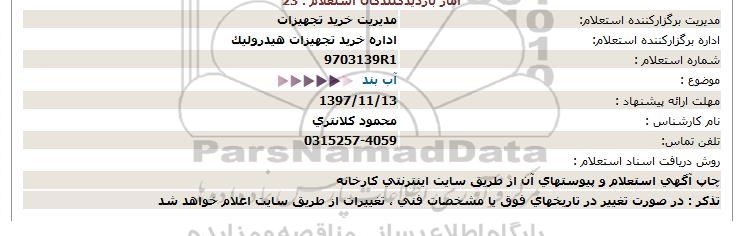 اداره برگزارکننده استعلام:     اداره خرید تجهیزات هیدرولیک