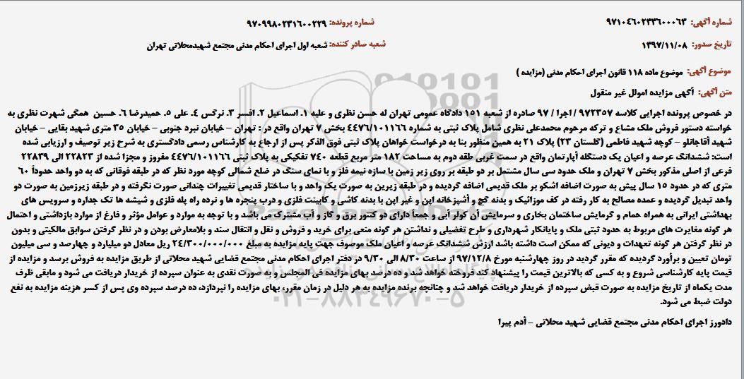 مزایده روز چهارشنبه مورخ 97.12.08 از ساعت 8:30 الی 9:30 در دفتر اجرای احکام مدنی مجتمع قضایی شهید محلاتی برگزار می گردد
