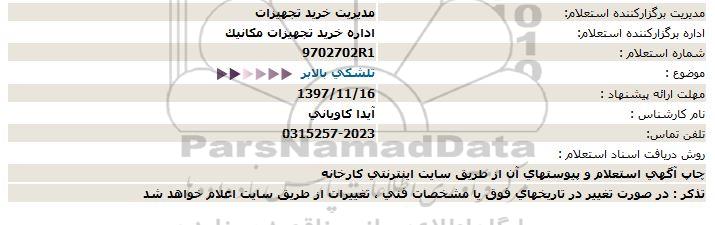 اداره برگزارکننده استعلام: اداره خرید تجهیزات مکانیک