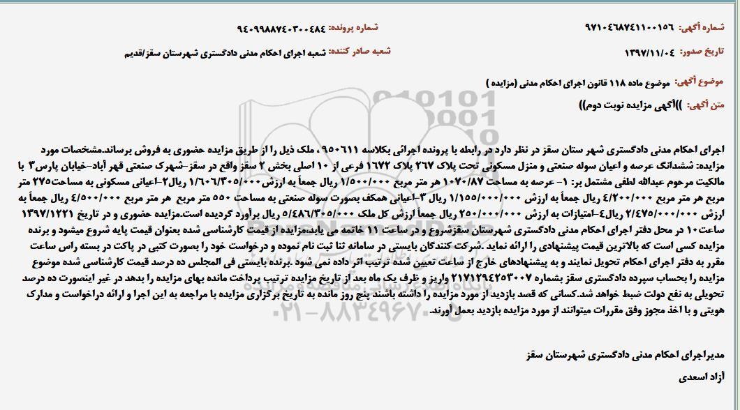 مزایده عمومی مزایده شش دانگ عرصه و اعیات سوله صنعتی و منزل مسکونی - نوبت دوم برگزار میگردد. از کلیه افراد متخصص و شرکتهای واجد شرایط دعوت به عمل میآید تا در این مزایده با کد خبرگزاری پارس نماد : 1488619 شرکت نمایند تاریخ شروع مزایده : 1397/11/09 مهلت شرکت در مزایده: تا پایان روز 1397/12/21 مکان برگزاری اموال واگذاری استانهای کردستان و دستهبندیهای مربوط به این حراجی آهن آلات, املاک و زمین میباشد.