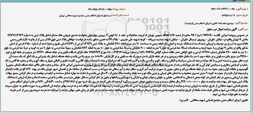 مزایده روز یک شنبه مورخ 97.12.05 از ساعت 8:30 الی 9:30 در دفتر اجرای احکام مدنی مجتمع قضایی شهید محلاتی