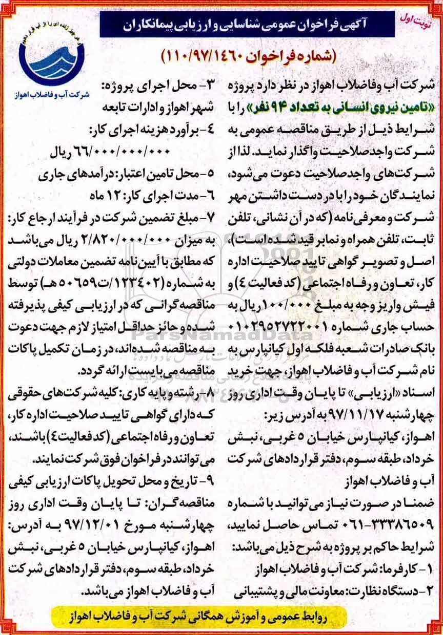 شرکت آب و فاضلاب اهواز در نظر دارد تامین نیروی انسانی به تعداد 94 نفر را با شرایط ذیل از طریق مناقصه عمومی به شرکت واجد صلاحیت واگذار نماید لذا از شرکت های واجد صلاحیت دعوت می شود نمایندگان خود را با در دست داشتن مهر شرکت و معرفی نامه که در آن نشانی تلفن ثابت، تلفن همراه و نمابر قید شده است اصل و تصویر گواهی تایید صلاحیت اداره تعاون و رفاه اجتماعی کد فعالیت 4 و فیش واریز وجه به مبلغ 100.000 ریال به حساب جاری 0102952722001 بانک صادارت شعبه فلکه اول کیانپارس به نام شرکت آب و فاضلاب اهواز جهت خرید اسناد ارزیابی تا پایان وقت اداری روز چهارشنبه 97.11.17 به آدرسی زیر