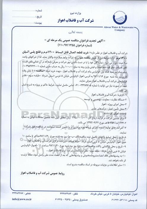 شرکت آب و فاضلاب اهواز در نظر دارد خرید قطعه اتصال قابل انبساط 1200 م م و فلنج پلی اتیلن 1200 م م را با شرایط ذیل از طریق مناقصه عمومی به شرکت واجد صلاحیت واگذار نماید لذا از شرکتهای واجد صلاحیت دعوت می شود نمایندگان خود را با در دست داشتن مهر شرکت و معرفی نامه که در آن نشانی، تلفن ثابت، تلفن همراه و نمابر قید شده است و فیش واریز وجه به مبلغ 100.000 ریال به حساب جاری شماره 0102952722001 بانک صادرات شعبه فلکه اول کیانپارس بنام شرکت آب و فاضلاب اهواز جهت خرید اسناد مناقصه تا پایان وقت اداری روز سه شنبه مورخ 97.11.16 به آدرس اهواز، کیانپارس، خیابان 5 غربی، نبش خرداد طبقه سوم دفتر قراردادهای شرکت آب و فاضلاب اهواز معرفی نمایند