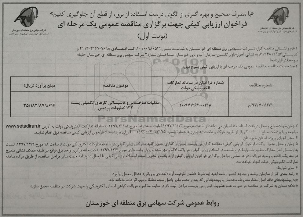 فراخوان مناقصه عملیات ساختمانی و تاسیساتی کارهای تکمیلی پست 132 کیلوولت, فراخوان ارزیابی کیفی مناقصه, فراخوان مناقصه عملیات ساختمانی و تاسیساتی کارهای تکمیلی پست 132 کیلوولت