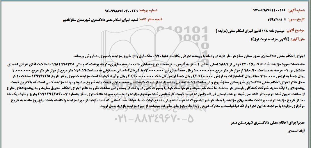 مزایده ملک پلاک 33 فرعی از 1886 اصلی