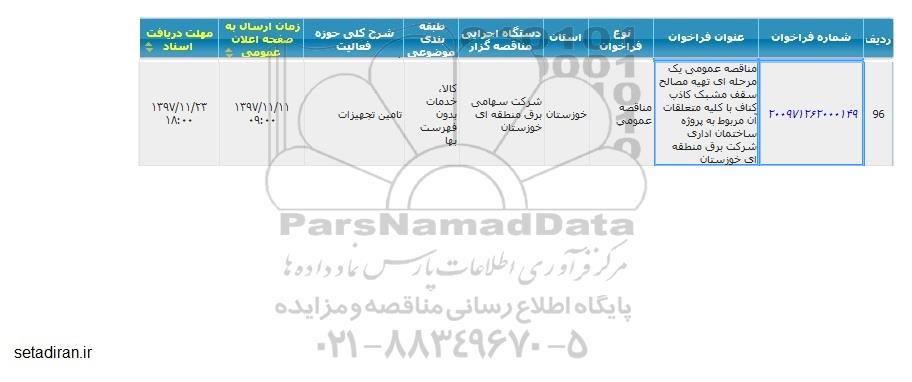 عنوان فراخوان: مناقصه عمومی یک مرحله ای تهیه مصالح سقف مشبک کاذب کناف با کلیه متعلقات آن مربوط به پروژه ساختمان اداری شرکت برق منطقه ای خوزستان
