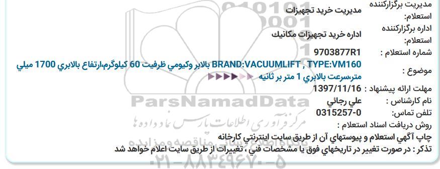 استعلام بها و موضوع استعلام استعلام , استعلام بالابر وکیومی به اطلاع کلیه شرکت‌ها و افراد متخصص واجد شرایط می‌رساند، آگهی گذار در نظر دارد از طریق استعلام بها، نسبت به انتخاب و دریافت پیشنهادات اقدام نماید. این استعلام با کد آگهی ثبت شده در سامانه خبرگزاری پارس نماد : 1494205 منتشر شده است. مشخصات استعلام : تاریخ شروع استعلام: 1397/11/13 آخرین مهلت ارسال پیشنهاد قیمت : 1397/11/16 و محل اجرای پروژه : استان اصفهان میباشد. استعلام قیمت مورد درخواست : استعلام , استعلام بالابر وکیومی با دسته‌بندی‌های تخصصی و گروه های مرتبط : بالابر صنعتی, جرثقیل, استعلام اطلاع رسانی میگردد.