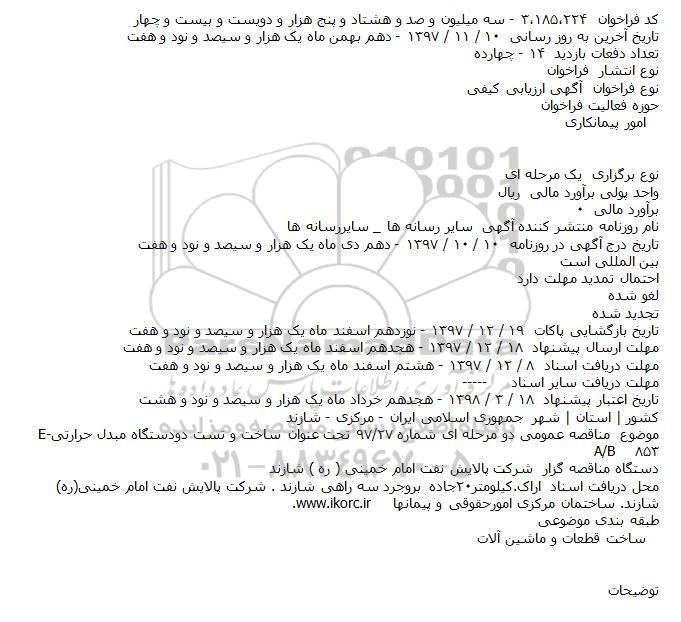 موضوع مناقصه عمومی دو مرحله ای شماره ۲۷.۹۷ تحت عنوان ساخت و تست دودستگاه مبدل حرارتی E-۸۵۳ A.B