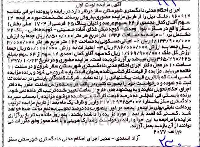 مزایده 64 سهم عرصه و اعیان پلاک 25 فرعی کلاسه 960914