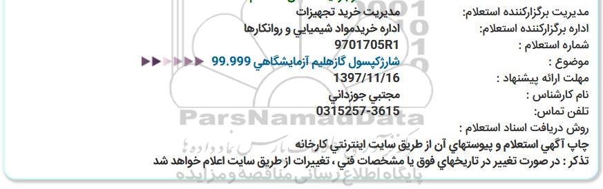 استعلام شارژ کپسول گاز هلیم آزمایشگاهی, استعلام , استعلام شارژ کپسول گاز هلیم آزمایشگاهی