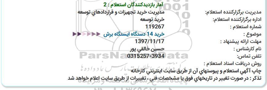 استعلام بها و موضوع استعلام استعلام ,استعلام خرید 14 دستگاه ایستگاه برش به اطلاع کلیه شرکتها و افراد متخصص واجد شرایط میرساند، آگهی گذار در نظر دارد از طریق استعلام بها، نسبت به انتخاب و دریافت پیشنهادات اقدام نماید. این استعلام با کد آگهی ثبت شده در سامانه خبرگزاری پارس نماد : 1496616 منتشر شده است. مشخصات استعلام : تاریخ شروع استعلام: 1397/11/14 آخرین مهلت ارسال پیشنهاد قیمت : 1397/11/17 و محل اجرای پروژه : استان اصفهان میباشد. استعلام قیمت مورد درخواست : استعلام ,استعلام خرید 14 دستگاه ایستگاه برش با دستهبندیهای تخصصی و گروه های مرتبط : دستگاه جوش و برش, تجهیزات و ماشین آلات صنعتی, استعلام اطلاع رسانی میگردد.