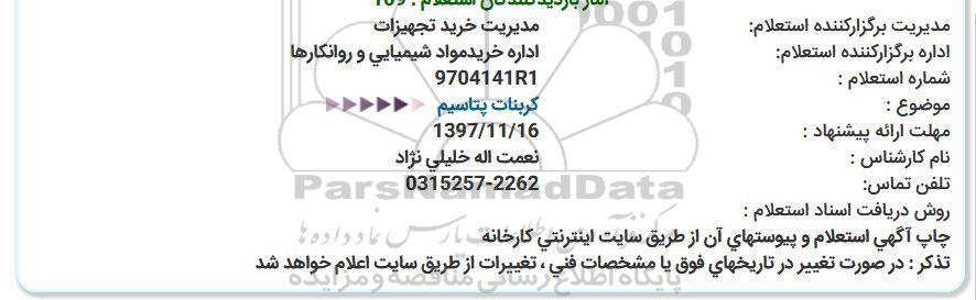 استعلام کربنات پتاسیم , استعلام ,استعلام کربنات پتاسیم