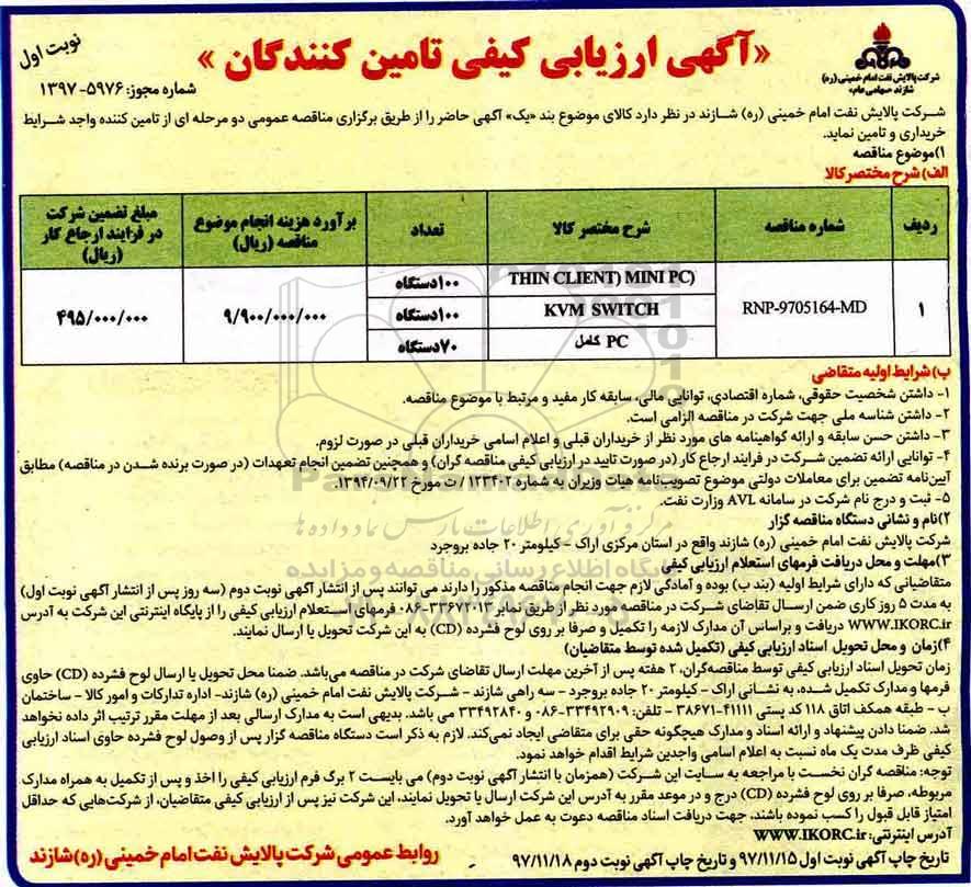 ارزیابی کیفی THIN CLIENT MINI PC از کلیه افراد متخصص و شرکتها واجد شرایط دعوت به عمل میآید در مناقصه با کد خبرگزاری پارس نماد: 1497540 شرکت نمایند.