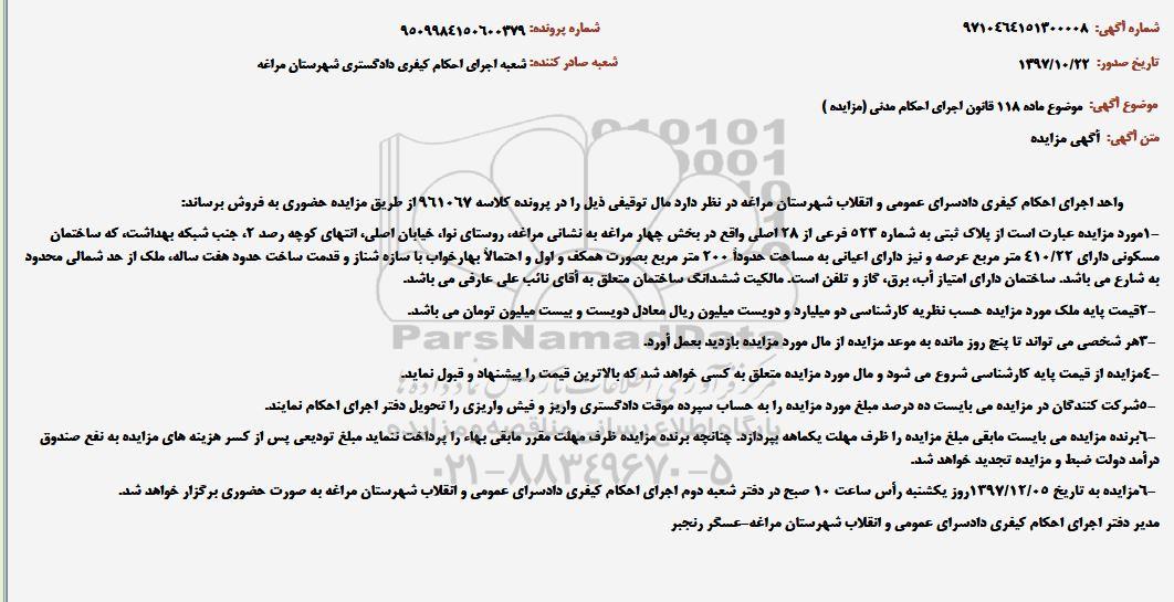 مزایده پلاک ثبتی 523 فرعی از 28 اصلی کلاسه 961067