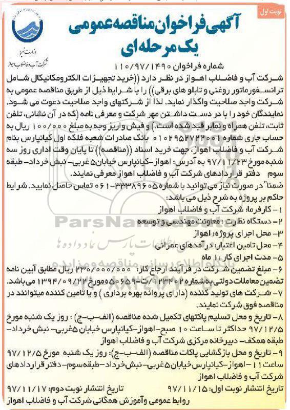 شرکت آب و فاضلاب اهواز در نظر دارد خرید تجهیزات الکترومکانیکال شامل ترانسفورماتور روغنی و تابلوهای برقی را با شرایط ذیل از طریق مناقصه عمومی به شرکت واجد صلاحیت واگذار نماید.