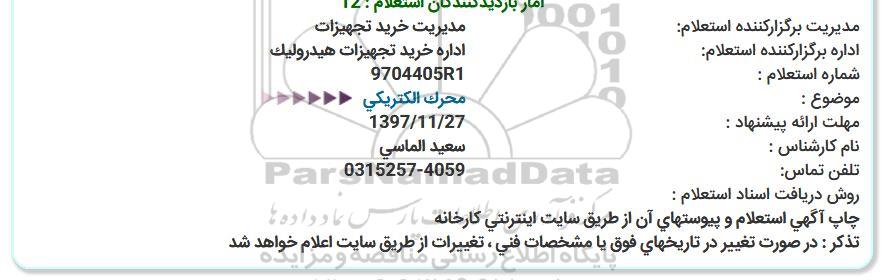 اداره برگزارکننده استعلام: اداره خرید تجهیزات هیدرولیک