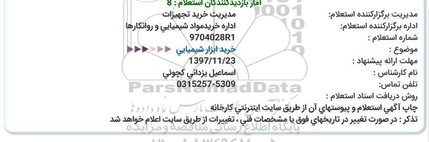 اداره برگزارکننده استعلام: اداره خرید مواد شیمیایی و روانکارها