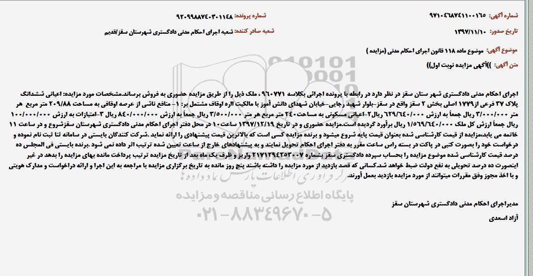 مزایدم ملک به پلاک 37 فرعی از 1779 اصلی