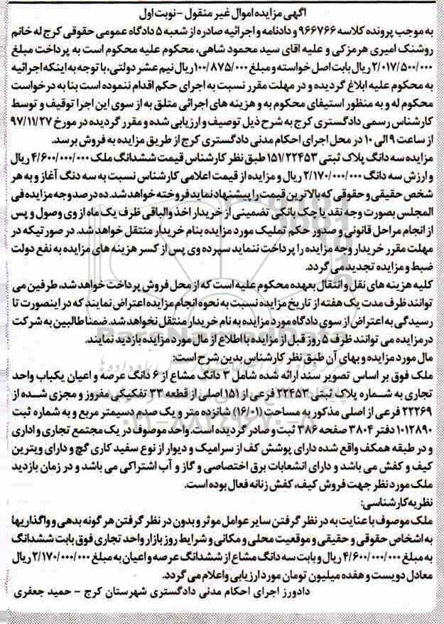 مزایده سه دانگ پلاک ثبتی 151.22453  نوبت اول کلاسه 966766