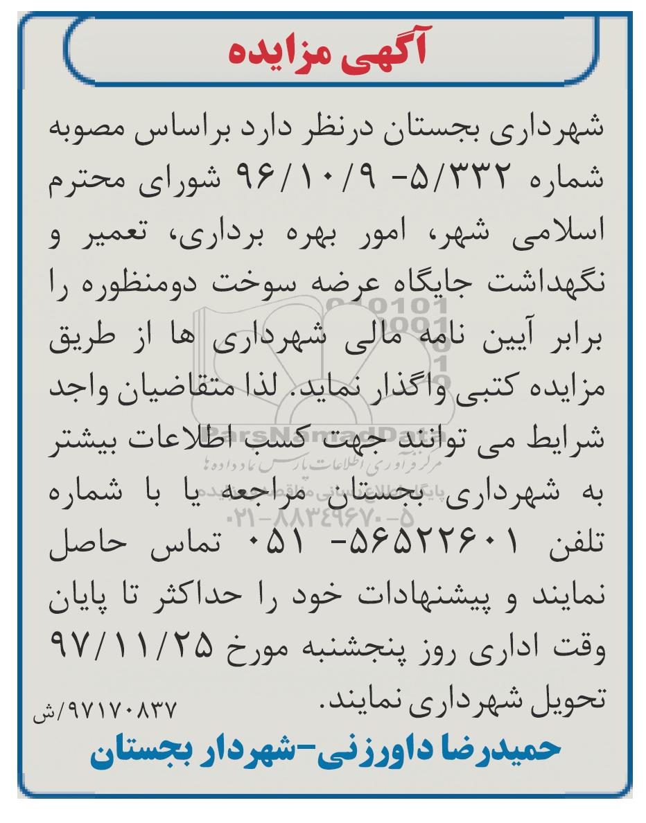 شهرداری بجستان در نظر دارد امور بهره برداری، تعمیر و نگهداشت جایگاه عرضه سوخت دو منظوره را برابر آیین نامه مالی شهرداری ها از طریق مزایده کتبی واگذار نماید لذا متقاضیان واجد شرایط می توانند جهت کسب اطلاعات بیشتر به شهرداری بجستان مراجعه یا با شماره تلفن 56522601-051 تماس حاصل نمایند و پیشنهادات خود را حداکثر تا پایان وقت اداری روز پنجشنبه مورخ 97.11.25 تحویل شهرداری نمایند
