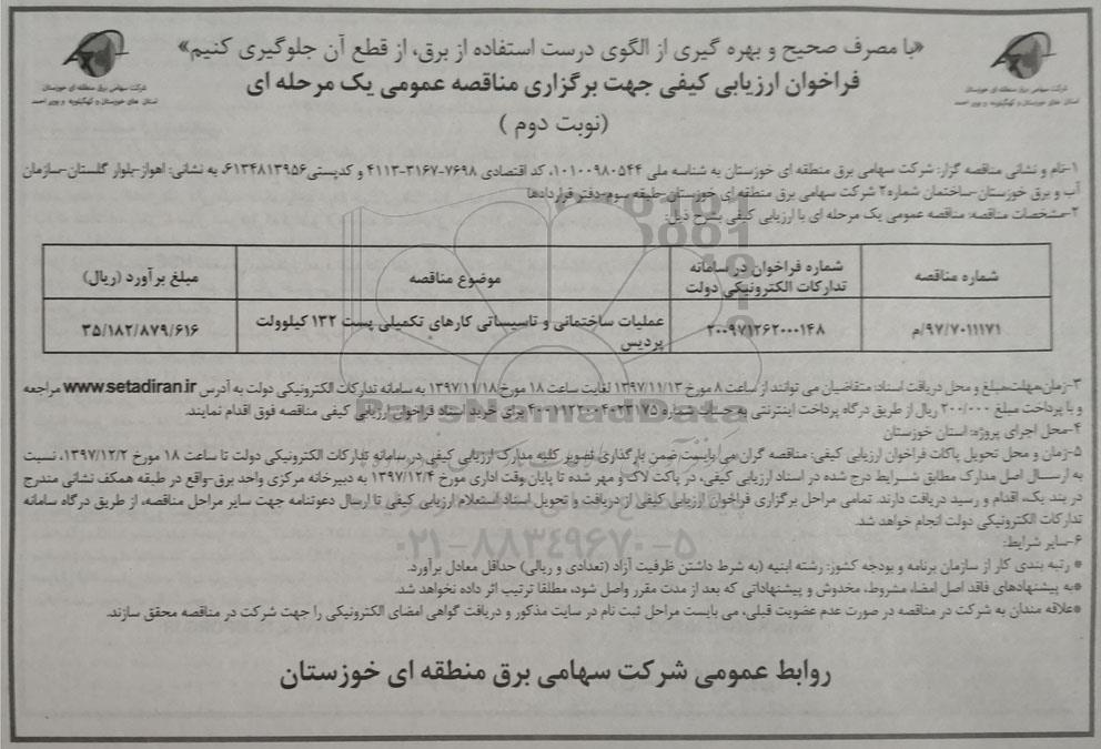 فراخوان مناقصه عملیات ساختمانی و تاسیساتی کارهای تکمیلی پست 132 کیلوولت نوبت دوم , فراخوان ارزیابی کیفی مناقصه, فراخوان مناقصه عملیات ساختمانی و تاسیساتی کارهای تکمیلی پست 132 کیلوولت نوبت دوم