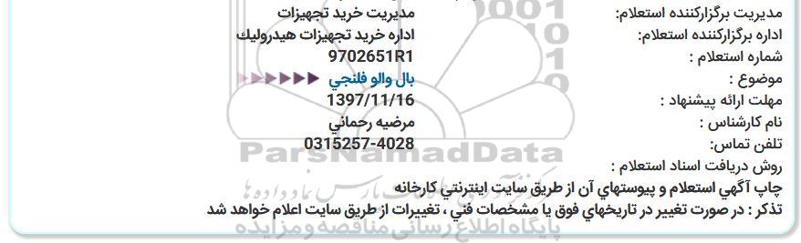 اداره برگزارکننده استعلام:     اداره خرید تجهیزات هیدرولیک
