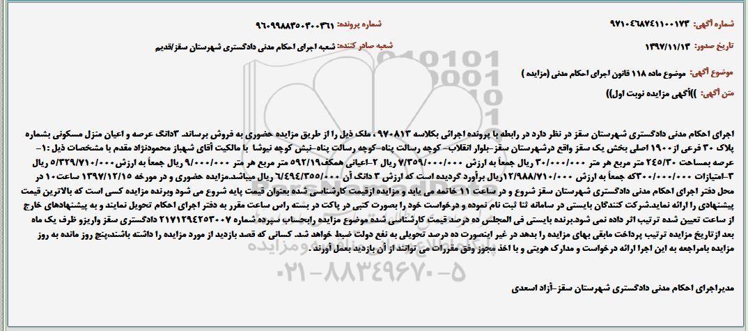 مزایده 3 دانگ عرصه و اعیان منزل مسکونی کلاسه 970813 نوبت اول