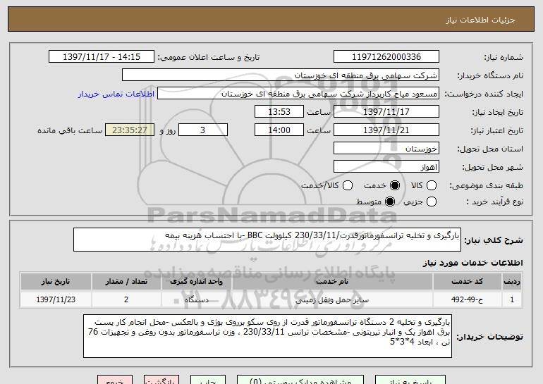 شرح کلی نیاز: بارگیری و تخلیه ترانسفورماتورقدرت/230/33/11 کیلوولت BBC -با احتساب هزینه بیمه