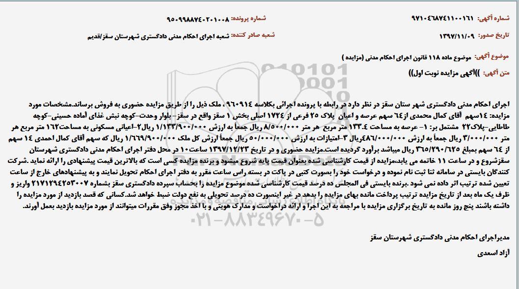 مزایده 14 سهم از 64 سهم پلاک 25 فرعی از 1724 اصلی