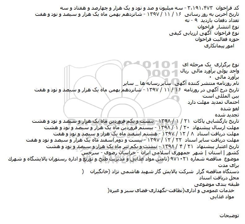 موضوع مناقصه شماره ٩٧١٠٢١ (تامین مواد غذایی و مدیریت طبخ و توزیع و اداره رستوران پالایشگاه و شهرک برای مدت