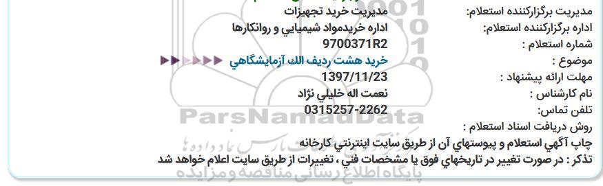 اداره برگزارکننده استعلام: اداره خرید مواد شیمیایی و روانکارها