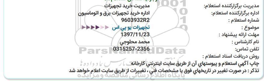اداره برگزارکننده استعلام: اداره خرید تجهیزات برق و اتوماسیون