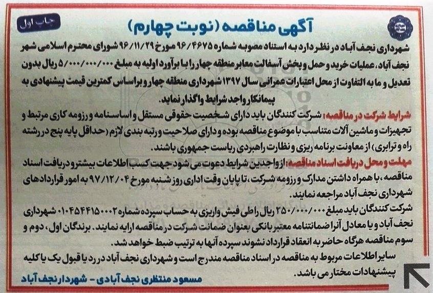شهرداری نجف آباد در نظر دارد عملیات خرید و حمل و پخش آسفالت معابر مناطق شهرداری نجف آباد با مجموع برآورد اولیه به مبلغ 5.000.000.000 ریال بدون تعدیل و مابه التفاوت از محل اعتبارات عمرانی سال 1397 شهرداری و براساس کمترین قیمت پیشنهادی به صورت مناقصات جداگانه حسب جدول زیر به پیمانکاران واجد شرایط واگذار نماید.