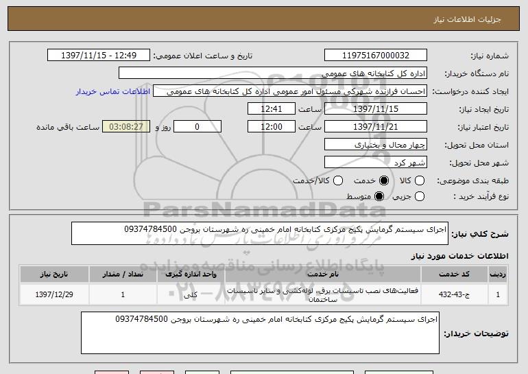 شرح کلی نیاز: اجرای سیستم گرمایش پکیج مرکزی کتابخانه امام خمینی ره شهرستان بروجن 09374784500